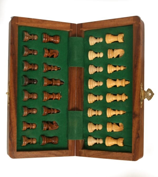 Experience timeless strategy and elegance with this handcrafted Sheesham Wood Chess Set. Featuring a foldable magnetic board with a soft foam lining, it ensures secure storage and easy portability. Measuring 5 x 10 inches, it’s compact yet spacious enough for immersive gameplay. The rich wood finish and smooth, polished pieces add a touch of sophistication to every move, making it perfect for both casual play and serious strategy sessions.