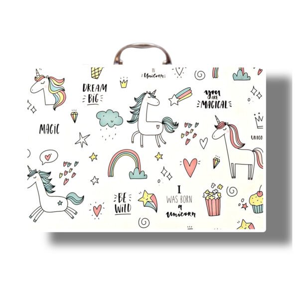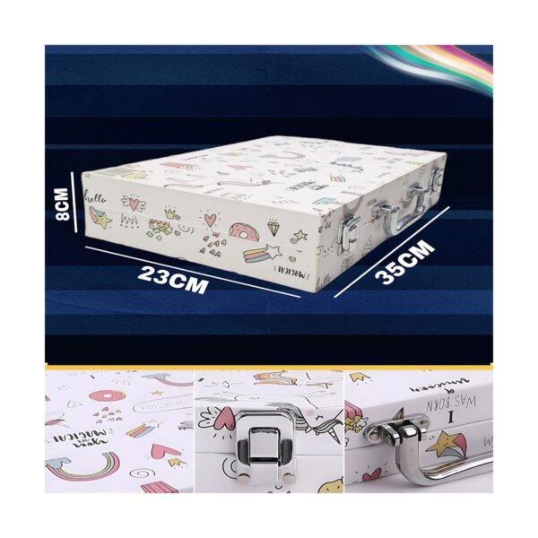 - Portable and Stylish: The silver-colored case with a black handle is not only functional but also adorned with whimsical doodles and inspiring phrases like “Dream Big” and “Magic.” It’s perfect for young artists on-the-go or at home.